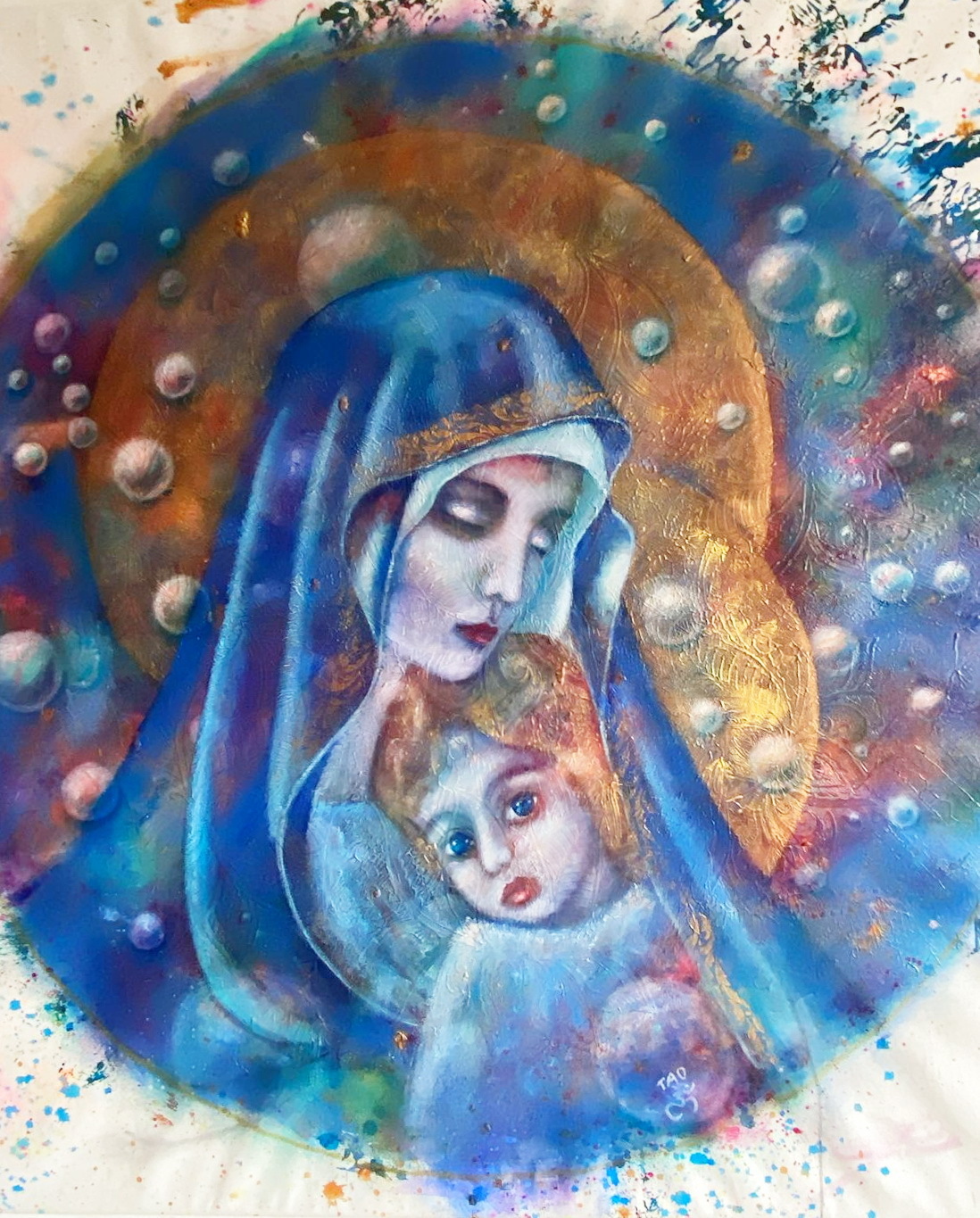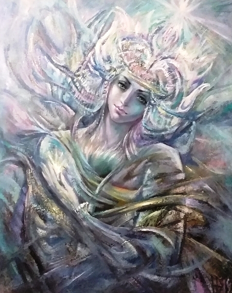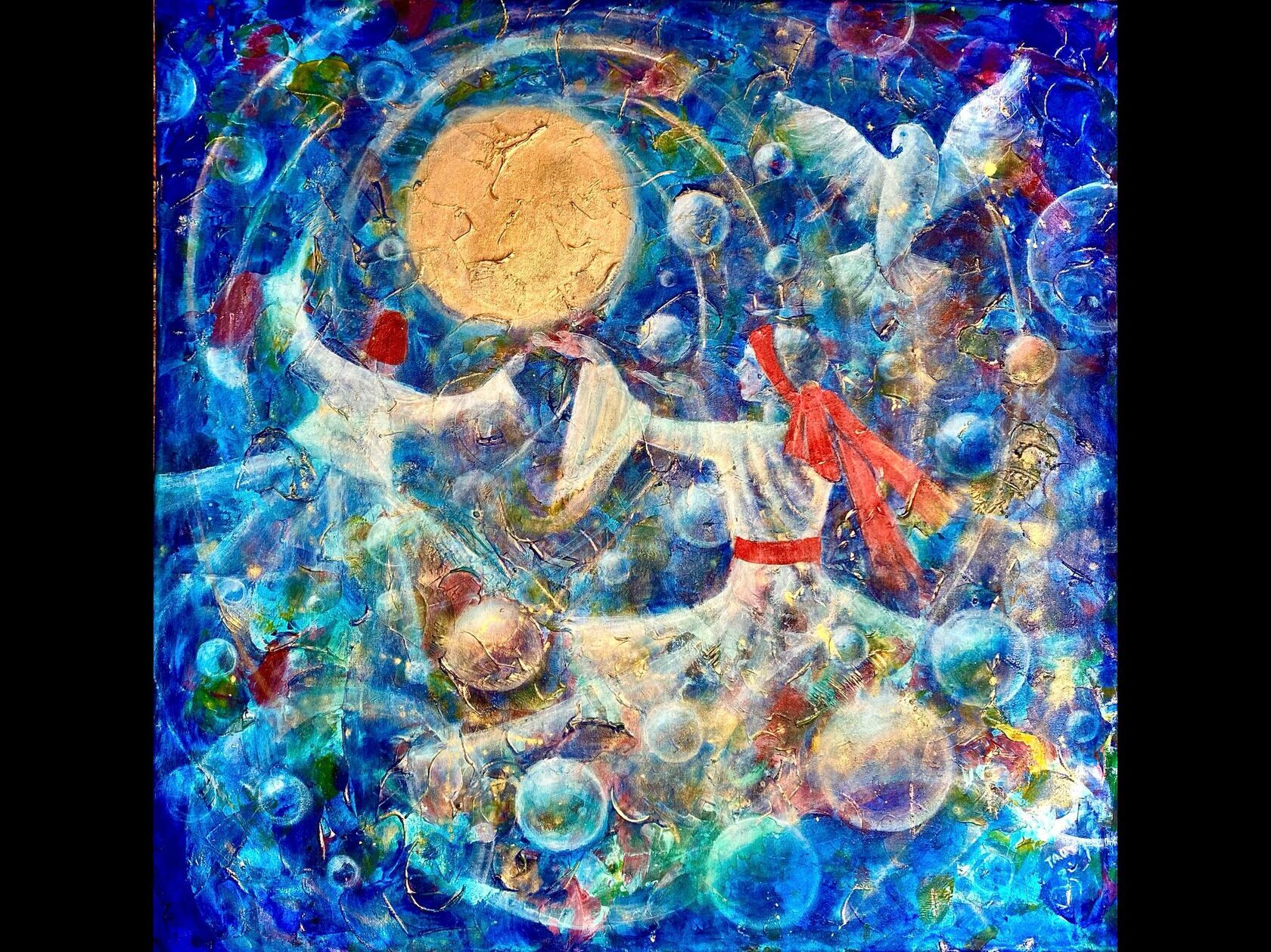 Техника: акрил Материалы: холст Размеры: 80х80 см. Год создания: 2022-2023 Сквозь волны глубокого сапфирового космоса, в завораживающем водовороте сияющих сфер, кружатся таинственные фигуры суфиев, словно сотканные из света и невесомости. Их одежды свободно парят в потоке незримой, но ощутимой энергии, переливаясь перламутровым и золотистым сиянием. Их танец, подобный бесконечной молитве, устремлён к золотистому свету в центре картины — сердцу Вселенной, пульсирующему тихим ритмом вечности. Белоснежный голубь, посланник мира и духа, сопровождает их движения, словно ведя танцоров по пути духовного пробуждения. Каждое движение в танце суфиев раскрывает глубочайшую философскую истину: Вселенная жива, а её сердцебиение — это вибрация единого, невыразимого слова, Логоса, преображающего невидимое в видимое, духовное — в материальное. Танцующие суфии кружатся и растворяются в ритме этого первичного принципа, где сознание и материя, душа и тело становятся единым целым. Их танец напоминает нам о древней, но зачастую забытой истине — всё в мироздании неразрывно связано и образует единое космическое существо. Вдали, за их фигурами, раскрываются галактики в мягких оттенках фиолетового, изумрудного и бирюзового цветов — величественные проявления космической гармонии, узоры которых отражают ритм и порядок, царящие во всей Вселенной. Каждая галактика тихо шепчет о том, что каждая мысль и каждое существо — лишь малая частица великого космического узора, связанного невидимыми нитями с общей симфонией бытия. Современный человек, заблудившийся в лабиринтах собственных мыслей и сомнений, забывает о том, что кризис его существования — это кризис осознания своего истинного места в общей вселенской гармонии. Но танец суфиев, подобно тихому обещанию Бодхисаттвы, пробуждает душу и напоминает, что пробуждение одного возможно лишь через пробуждение всех. Они кружатся, и в каждом их повороте звучит обещание помочь миру вновь обрести утраченную гармонию и свет — напоминание о едином сознании, связывающем всё живое. Цена договорная.